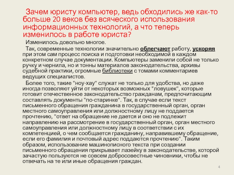 Слайд 4 Зачем юристу компьютер, ведь обходились же как-то больше 20 веков