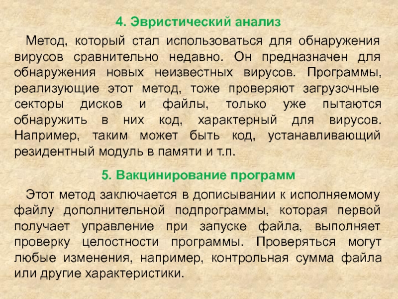 Метод, который стал использоваться для обнаружения вирусов сравнительно недавно. Он предназначен для обнаружения новых неизвестных вирусов. Программы, реализующие этот метод, тоже проверяют загрузочные секторы дисков и файлы, только уже пытаются обнаружить в них код, характерный для вирусов. Например, таким может быть код, устанавливающий резидентный модуль в памяти и т.п.