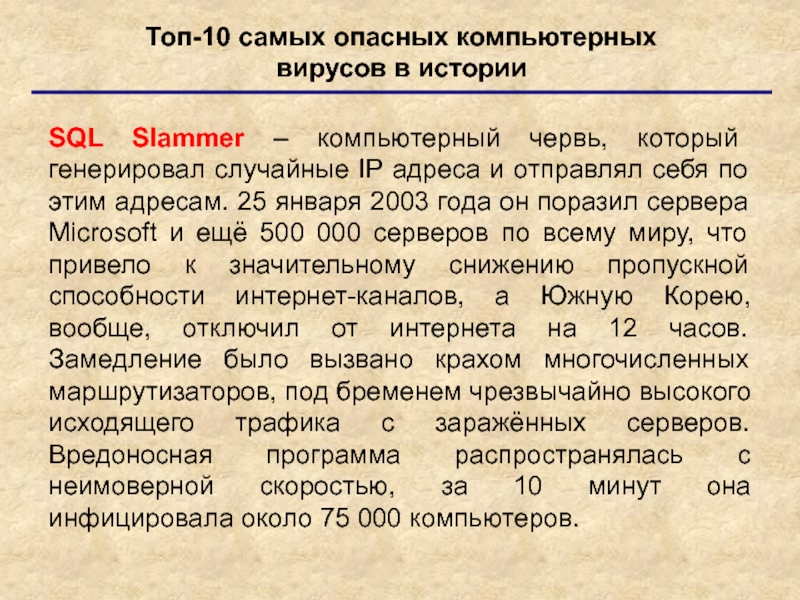 этим адресам. 25 января 2003 года он поразил сервера Microsoft и ещё 500 000 серверов по всему миру, что привело к значительному снижению пропускной способности интернет-каналов, а Южную Корею, вообще, отключил от интернета на 12 часов. Замедление было вызвано крахом многочисленных маршрутизаторов, под бременем чрезвычайно высокого исходящего трафика с заражённых серверов. Вредоносная программа распространялась с неимоверной скоростью, за 10 минут она инфицировала около 75 000 компьютеров.