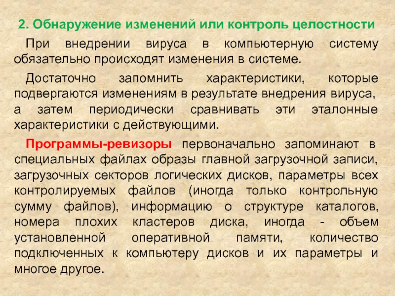 Программы-ревизоры первоначально запоминают в специальных файлах образы главной загрузочной записи, загрузочных секторов логических дисков, параметры всех контролируемых файлов (иногда только контрольную сумму файлов), информацию о структуре каталогов, номера плохих кластеров диска, иногда - объем установленной оперативной памяти, количество подключенных к компьютеру дисков и их параметры и многое другое.
