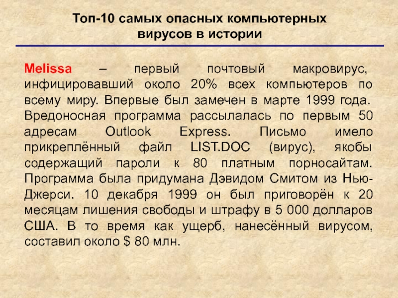 Слайд 38Топ-10 самых опасных компьютерных вирусов в истории