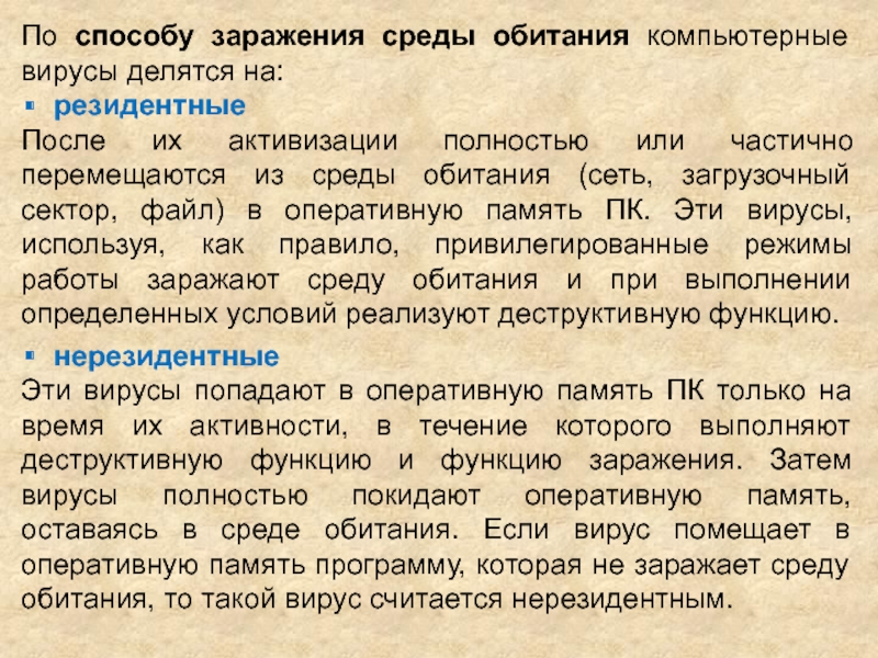 сектор, файл) в оперативную память ПК. Эти вирусы, используя, как правило, привилегированные режимы работы заражают среду обитания и при выполнении определенных условий реализуют деструктивную функцию.