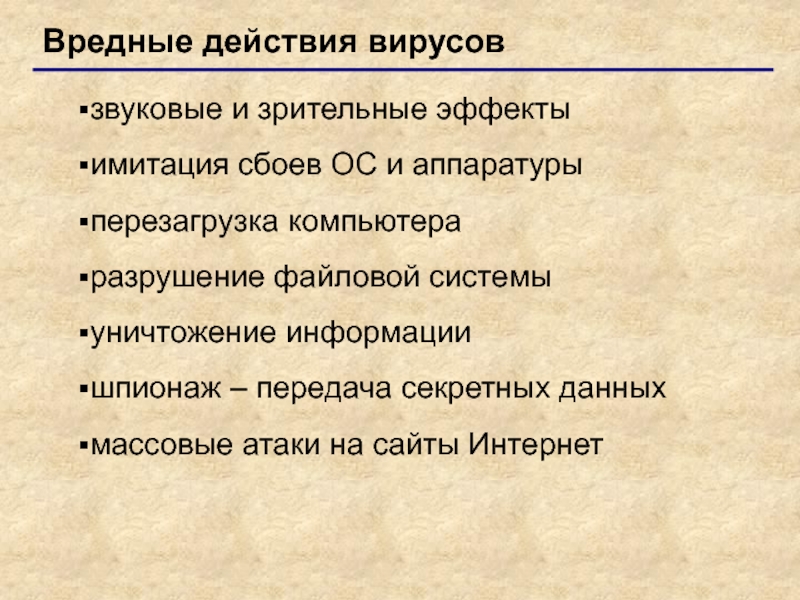 также вирусы, блокирующие доступ к информации, приводящие к отказу аппаратных средств и наносящие ущерб здоровью пользователям.