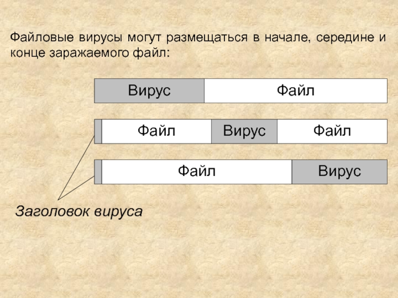 файловые – заражают файлы *.exe, *.sys, *.dll (редко – внедряются в тексты программ);