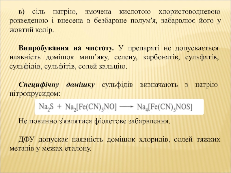 У препараті не допускається наявність домішок миш’яку, селену, карбонатів, сульфатів, сульфідів, сульфітів, солей кальцію.