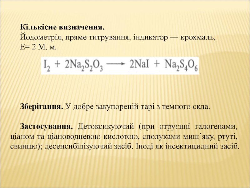 Детоксикуючий (при отруєнні галогенами, ціаном та ціановодневою кислотою, сполуками миш’яку, ртуті, свинцю); десенсибілізуючий засіб. Іноді як інсектицидний засіб.