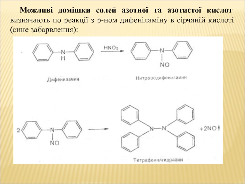 Слайд 6Можливі домішки солей азотної та азотистої кислот визначають по реакції