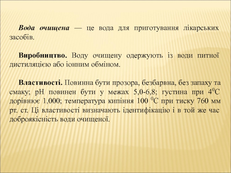Воду очищену одержують із води питної дистиляцією або іонним обміном.