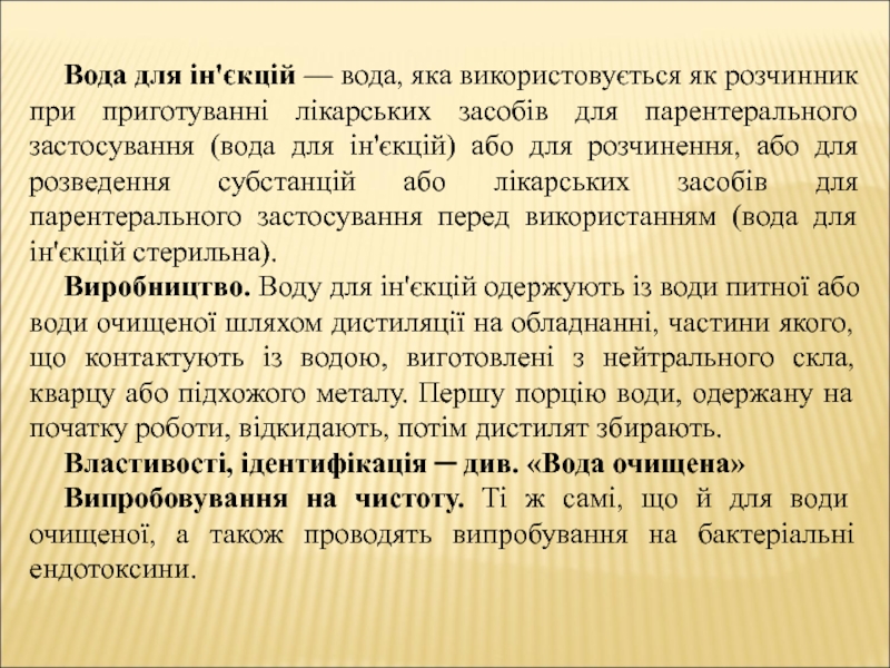 Слайд 10Вода для ін'єкцій — вода, яка використовується як розчинник при