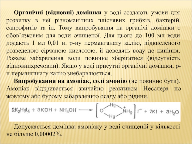 на органічі домішки є обов’язковим для води очищеної. Для цього до 100 мл води додають 1 мл 0,01 н. р-ну перманганату калію, підкисленого розведеною сірчаною кислотою, й доводять воду до кипіння. Рожеве забарвлення води повинне зберігатися (відсутність відновнихречовин). Якщо у воді присутні органічні домішки, р-н перманганату калію знебарвлюється.