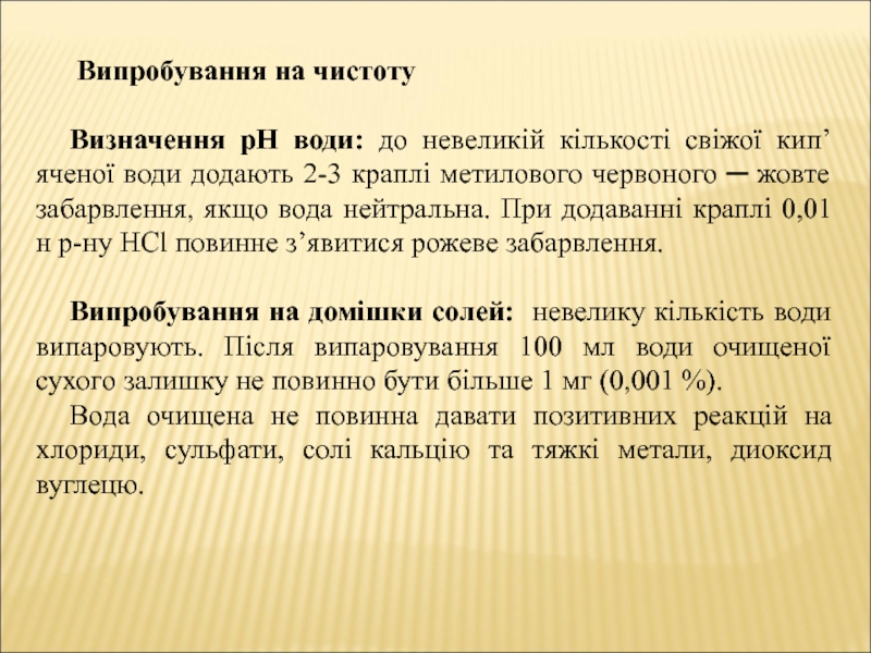 Вода очищена не повинна давати позитивних реакцій на хлориди, сульфати, солі кальцію та тяжкі метали, диоксид вуглецю.