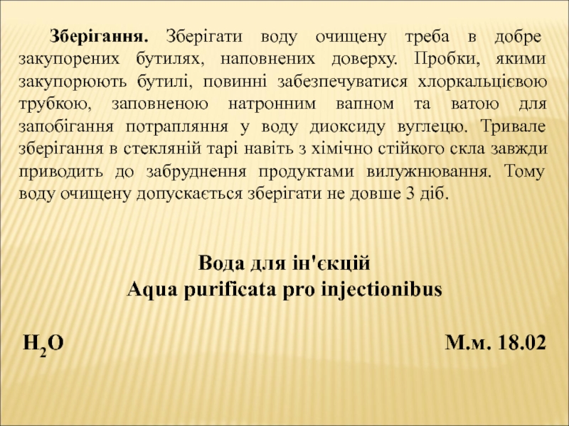 Слайд 9 Зберігання. Зберігати воду очищену треба в добре закупорених бутилях,