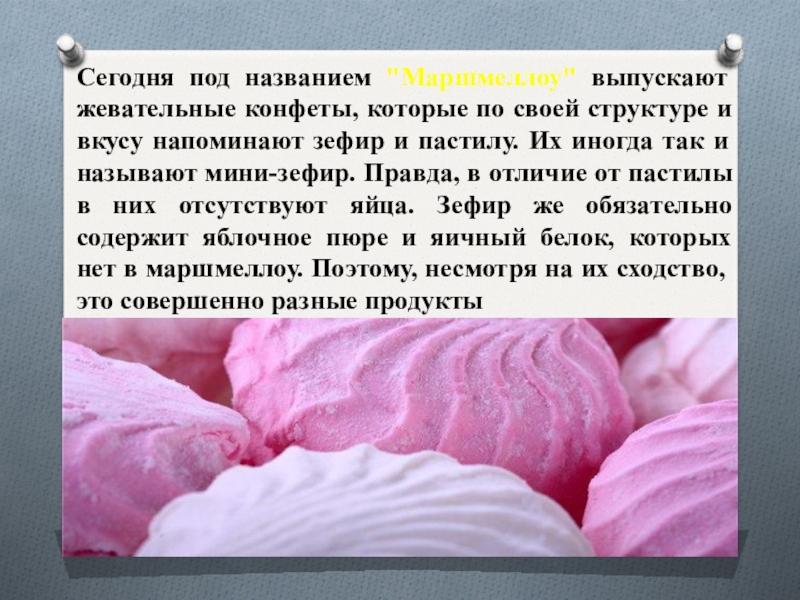 В нашей стране они появились сравнительно недавно и ещё малоизвестны. Эти зефироподобные конфеты чаще всего белые, хотя встречаются и другие цвета. Существуют варианты в глазури (шоколадной, карамельной), с орехами. Форму они имеют различную: круглую, квадратную, цилиндры и даже четырёхцветные «жгутики». Размер также варьируется.