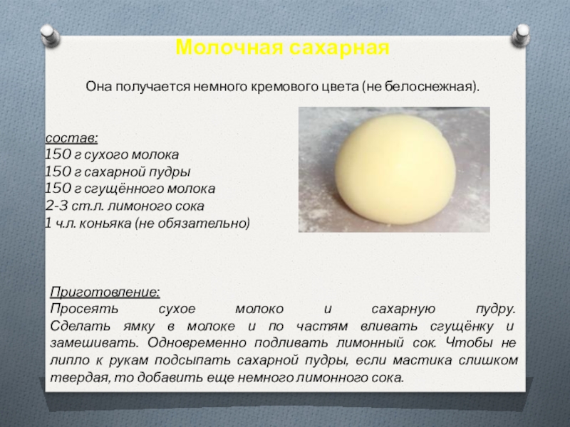 Сделать ямку в молоке и по частям вливать сгущёнку и замешивать. Одновременно подливать лимонный сок. Чтобы не липло к рукам подсыпать сахарной пудры, если мастика слишком твердая, то добавить еще немного лимонного сока.