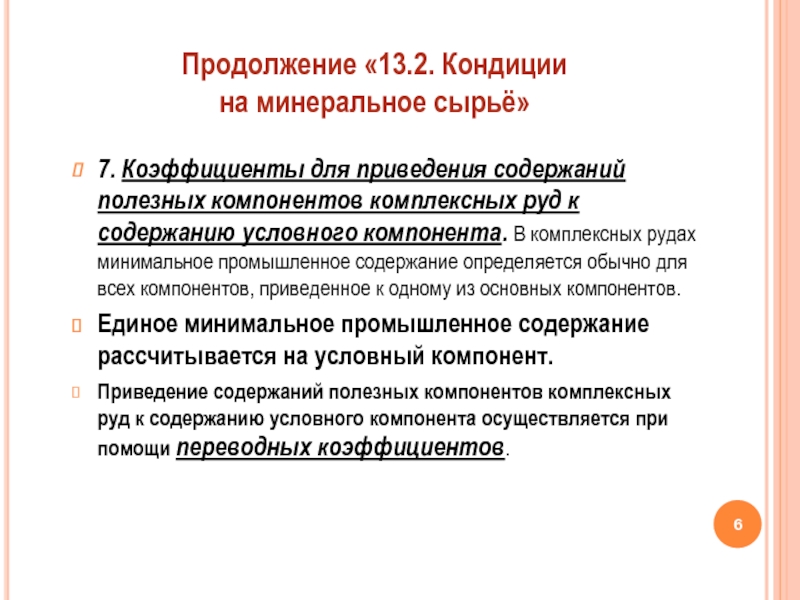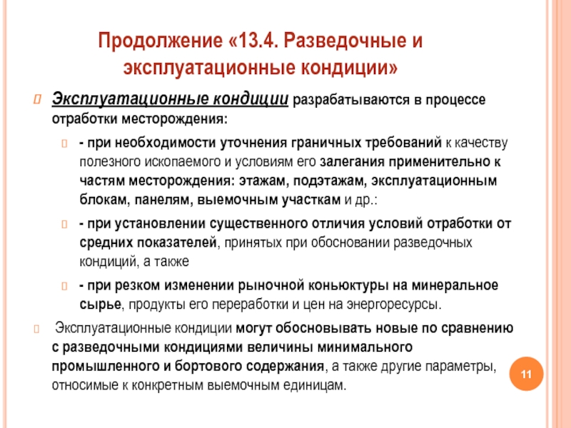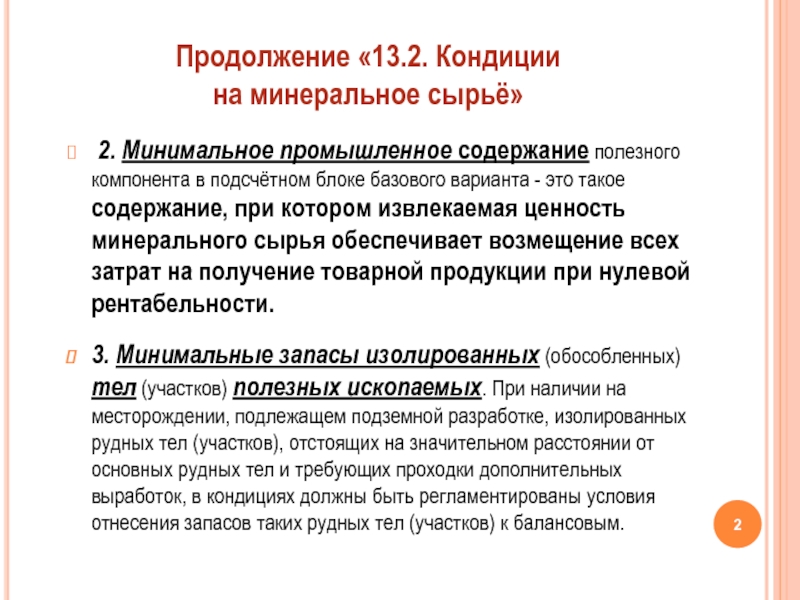 комплексное и безопасное использование недр на рациональной экономической основе с учётом экологических последствий эксплуатации месторождения.1. Бортовое содержание - это наименьшее содержание полезных компонентов в пробах, включаемых в подсчёт запасов при оконтуривании тела полезного ископаемого по мощности (пересечению разведочной выработкой) в случае отсутствия его чётких геологических границ. Бортовое содержание выражается содержанием полезного компонента, а в месторождениях комплексных руд - суммой имеющих промышленное значение содержаний полезных компонентов, приведенных к содержанию условного компонента, имеющего максимальную извлекаемую ценность.