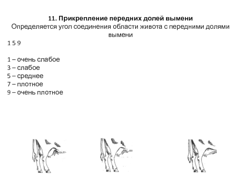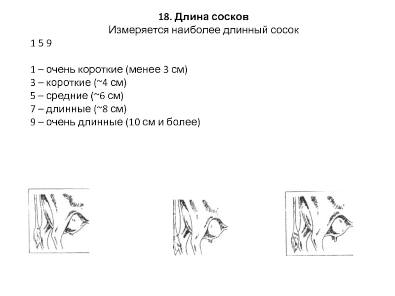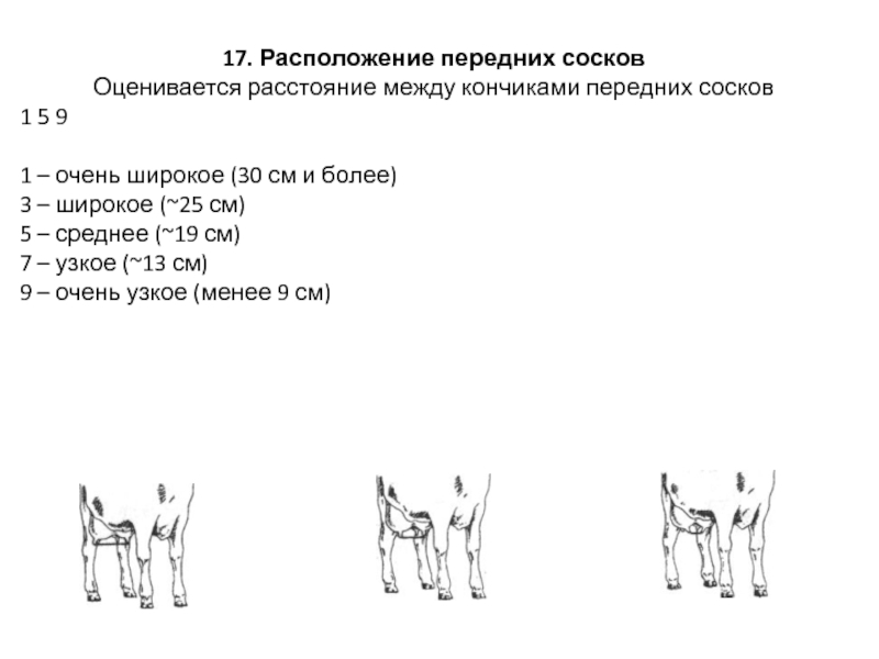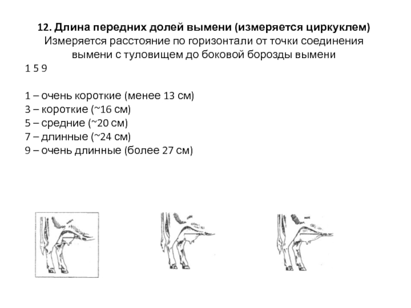 Слайд 2212. Длина передних долей вымени (измеряется циркуклем)
