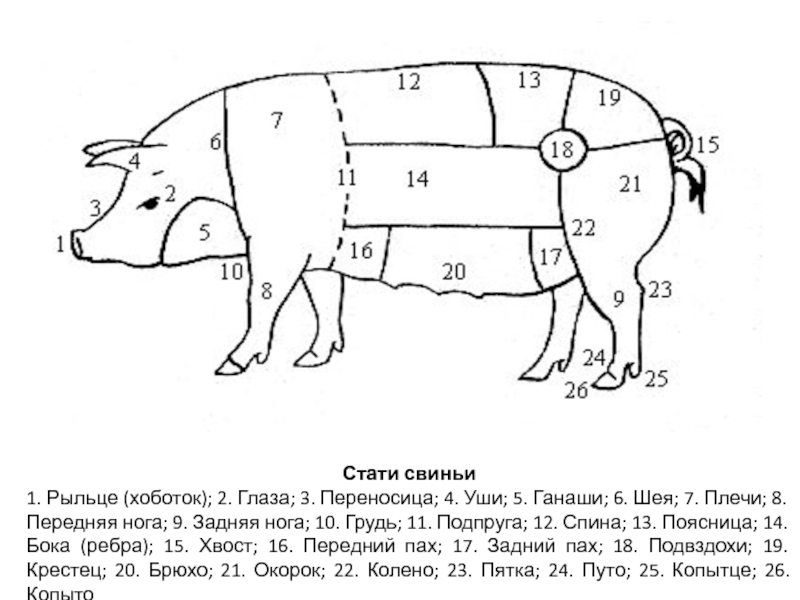 Задняя нога; 10. Грудь; 11. Подпруга; 12. Спина; 13. Поясница; 14. Бока (ребра); 15. Хвост; 16. Передний пах; 17. Задний пах; 18. Подвздохи; 19. Крестец; 20. Брюхо; 21. Окорок; 22. Колено; 23. Пятка; 24. Путо; 25. Копытце; 26. Копыто