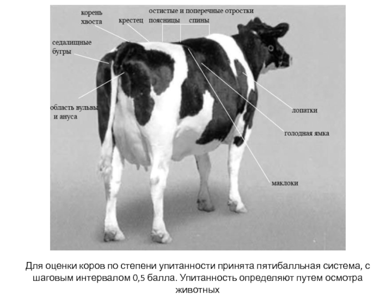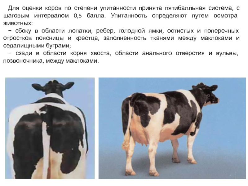 Слайд 4Для оценки коров по степени упитанности принята пятибалльная система, с