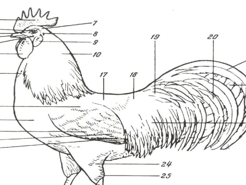 10. Грива; 11. Шейные перья; 12. Плечо; 13. Грудь; 14. Кроющие перья; 15. Вторичные маховые перья; 16. Первичные маховые перья; 17. Спина; 18. Поясница; 19. Кроющие перья хвоста; 20. Малые косицы; 21. Большие косицы; 22. Рулевые перья; 23. Поясничные перья; 24. Голень; 25. Пятка; 26. Плюсна; 27. Подошва; 28. Коготь; 29. Палец; 30. Шпора