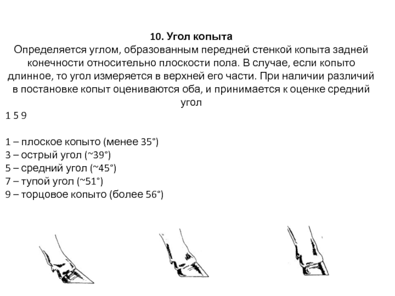 угол измеряется в верхней его части. При наличии различий в постановке копыт оцениваются оба, и принимается к оценке средний угол
