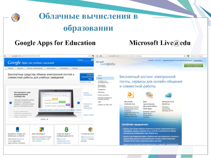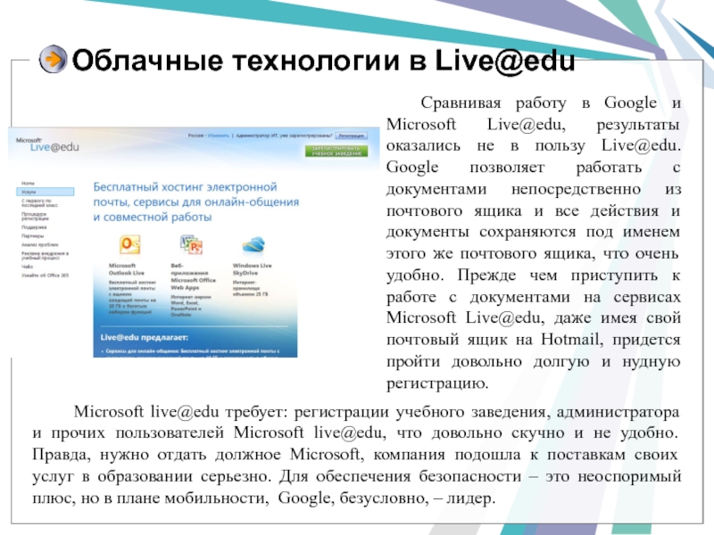 Сравнивая работу в Google и Microsoft Live@edu, результаты оказались не в пользу Live@edu. Google позволяет работать с документами непосредственно из почтового ящика и все действия и документы сохраняются под именем этого же почтового ящика, что очень удобно. Прежде чем приступить к работе с документами на сервисах Microsoft Live@edu, даже имея свой почтовый ящик на Hotmail, придется пройти довольно долгую и нудную регистрацию.