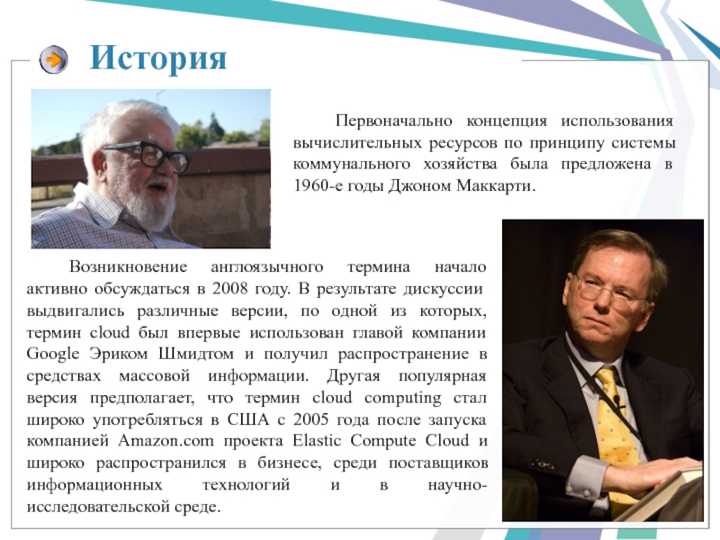 Первоначально концепция использования вычислительных ресурсов по принципу системы коммунального хозяйства была предложена в 1960-е годы Джоном Маккарти.
