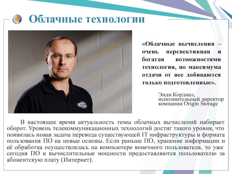 В настоящее время актуальность темы облачных вычислений набирает оборот. Уровень телекоммуникационных технологий достиг такого уровня, что появилась новая задача перевода существующей IT инфраструктуры и формата пользования ПО на новые основы. Если раньше ПО, хранение информации и её обработка осуществлялась на компьютере конечного пользователя, то уже сегодня ПО и вычислительные мощности предоставляются пользователю за абонентскую плату (Интернет).