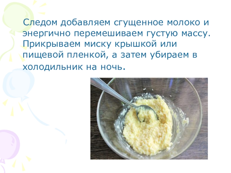 Слайд 5 Следом добавляем сгущенное молоко и энергично перемешиваем густую