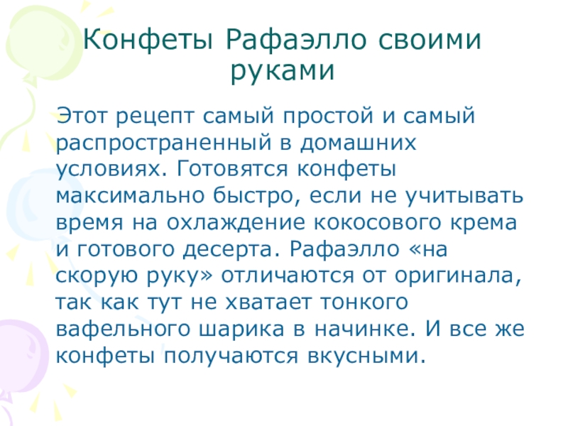 не учитывать время на охлаждение кокосового крема и готового десерта. Рафаэлло «на скорую руку» отличаются от оригинала, так как тут не хватает тонкого вафельного шарика в начинке. И все же конфеты получаются вкусными.