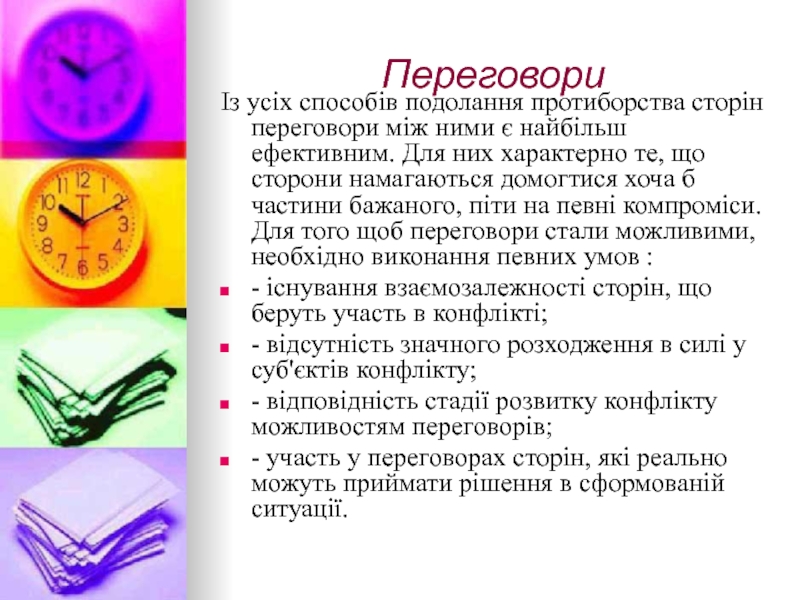 хоча б частини бажаного, піти на певні компроміси. Для того щоб переговори стали можливими, необхідно виконання певних умов :