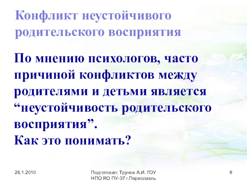 Слайд 8Конфликт неустойчивого родительского восприятия