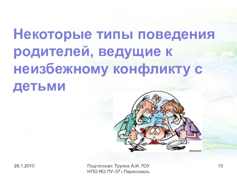 Слайд 13Некоторые типы поведения родителей, ведущие к неизбежному конфликту с детьми