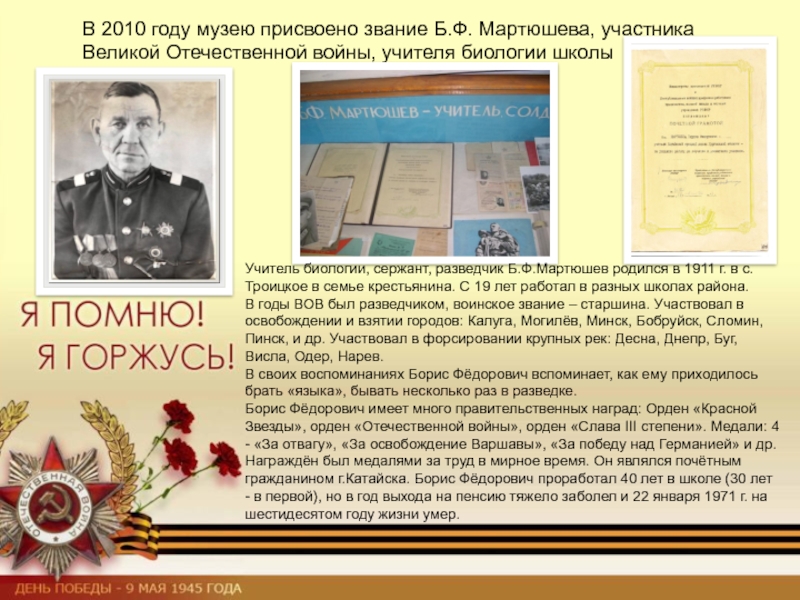 Слайд 3В 2010 году музею присвоено звание Б.Ф. Мартюшева, участника Великой