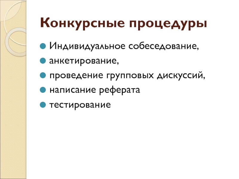 Конкурсные процедуры Индивидуальное собеседование, анкетирование, проведение групповых дискуссий, написание реферата тестирование