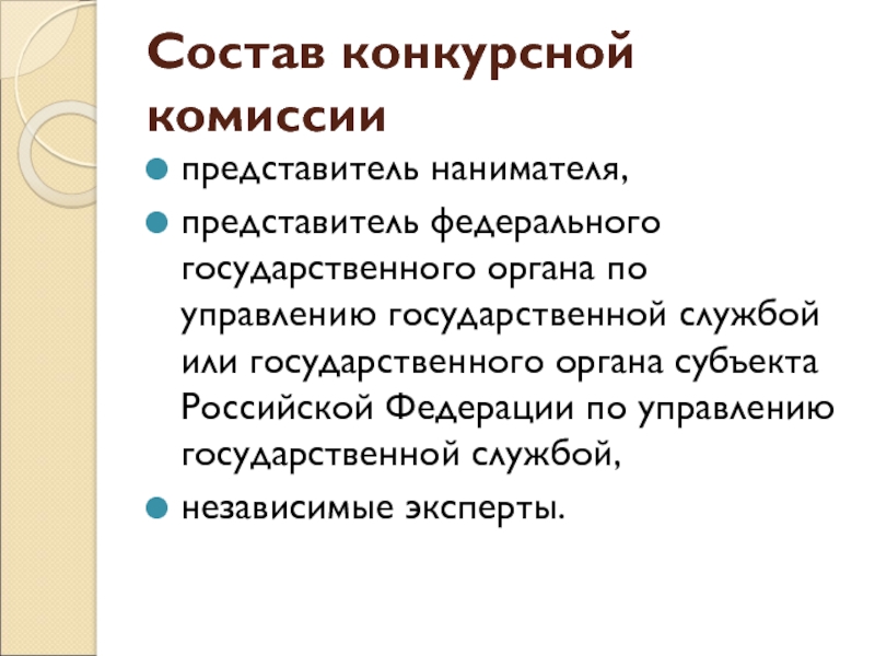 Состав конкурсной комиссиипредставитель нанимателя, представитель федерального государственного органа по управлению государственной службой или государственного органа субъекта Российской