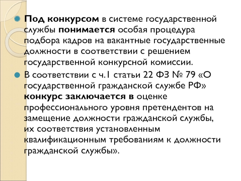 Под конкурсом в системе государственной службы понимается особая процедура подбора кадров на вакантные государственные должности в соответствии