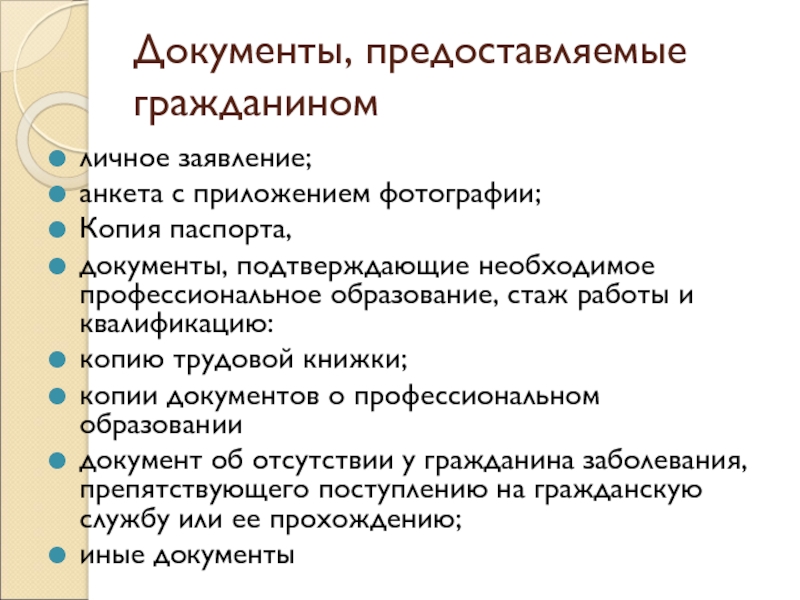 Документы, предоставляемые гражданиномличное заявление;анкета с приложением фотографии;Копия паспорта,документы, подтверждающие необходимое профессиональное образование, стаж работы и квалификацию:копию трудовой