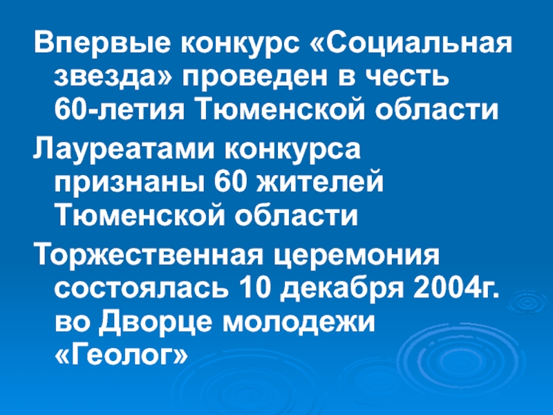 Впервые конкурс «Социальная звезда» проведен в честь 60-летия Тюменской областиЛауреатами конкурса признаны 60 жителей Тюменской областиТоржественная церемония состоялась 10 декабря 2004г. во Дворце молодежи «Геолог»