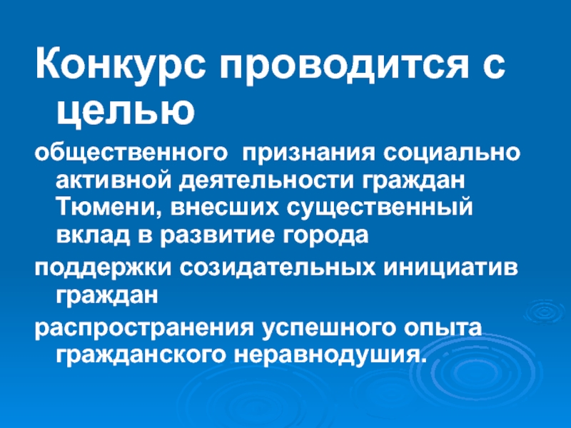 Конкурс проводится с цельюобщественного признания социально активной деятельности граждан Тюмени, внесших существенный вклад в развитие городаподдержки созидательных