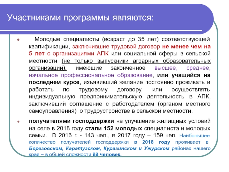 с организациями АПК или социальной сферы в сельской местности (не только выпускники аграрных образовательных организаций), имеющие законченное высшее, среднее, начальное профессиональное образование, или учащийся на последнем курсе, изъявивший желание постоянно проживать и работать по трудовому договору, или осуществлять индивидуальную предпринимательскую деятельность в АПК, заключивший соглашение с работодателем (органом местного самоуправления) о трудоустройстве в сельской местности.