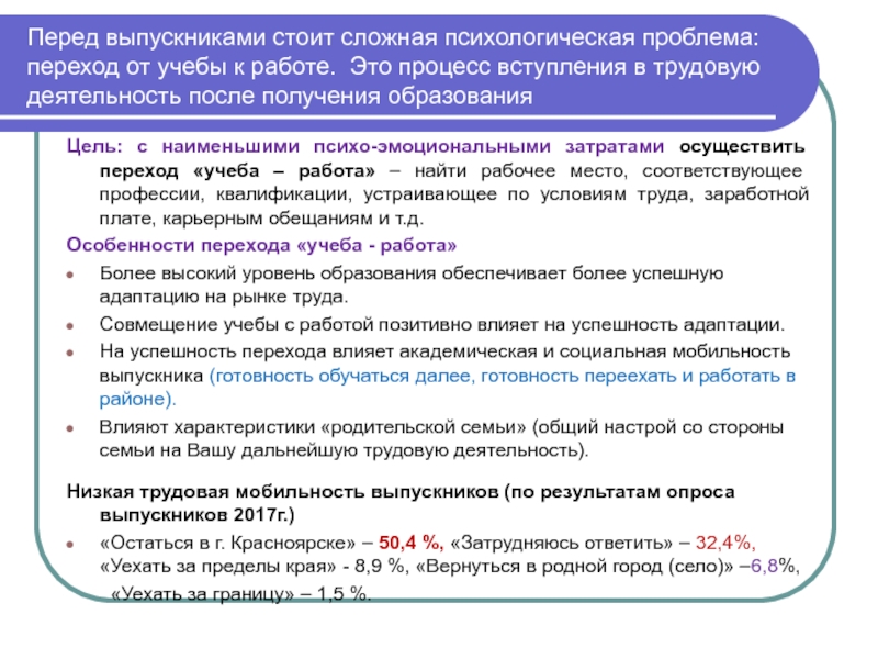 Слайд 7Перед выпускниками стоит сложная психологическая проблема: переход от учебы к