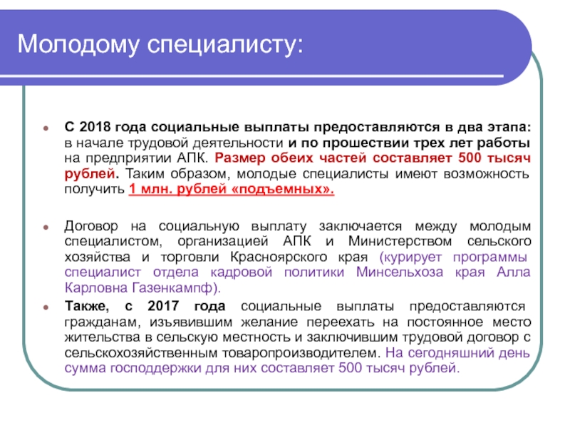 Договор на социальную выплату заключается между молодым специалистом, организацией АПК и Министерством сельского хозяйства и торговли Красноярского края (курирует программы специалист отдела кадровой политики Минсельхоза края Алла Карловна Газенкампф).