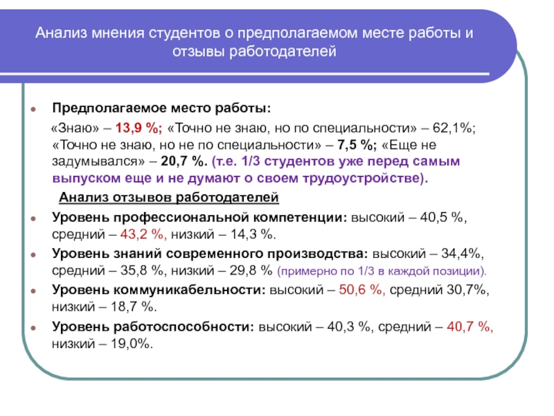 Слайд 8Анализ мнения студентов о предполагаемом месте работы и отзывы работодателей