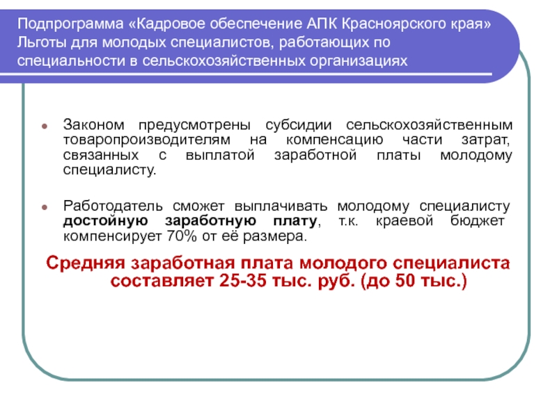 Слайд 10Подпрограмма «Кадровое обеспечение АПК Красноярского края» Льготы для молодых специалистов,