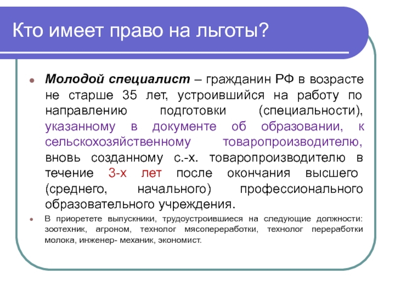 подготовки (специальности), указанному в документе об образовании, к сельскохозяйственному товаропроизводителю, вновь созданному с.-х. товаропроизводителю в течение 3-х лет после окончания высшего (среднего, начального) профессионального образовательного учреждения.