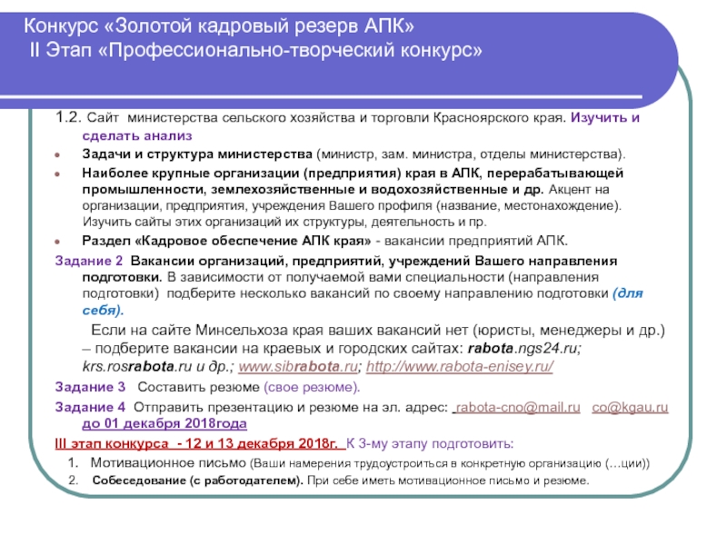 Задание 4 Отправить презентацию и резюме на эл. адрес: rabota-cno@mail.ru co@kgau.ru до 01 декабря 2018года