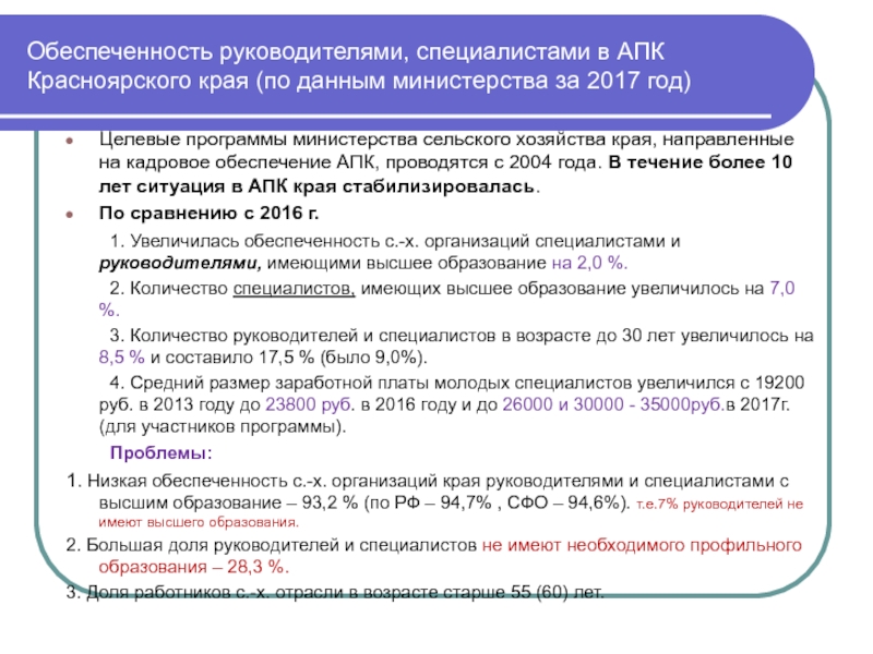 1. Низкая обеспеченность с.-х. организаций края руководителями и специалистами с высшим образование – 93,2 % (по РФ – 94,7% , СФО – 94,6%). т.е.7% руководителей не имеют высшего образования.