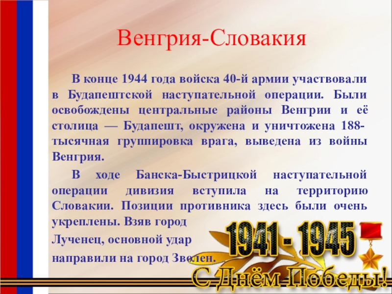 В ходе Банска-Быстрицкой наступательной операции дивизия вступила на территорию Словакии. Позиции противника здесь были очень укреплены. Взяв город