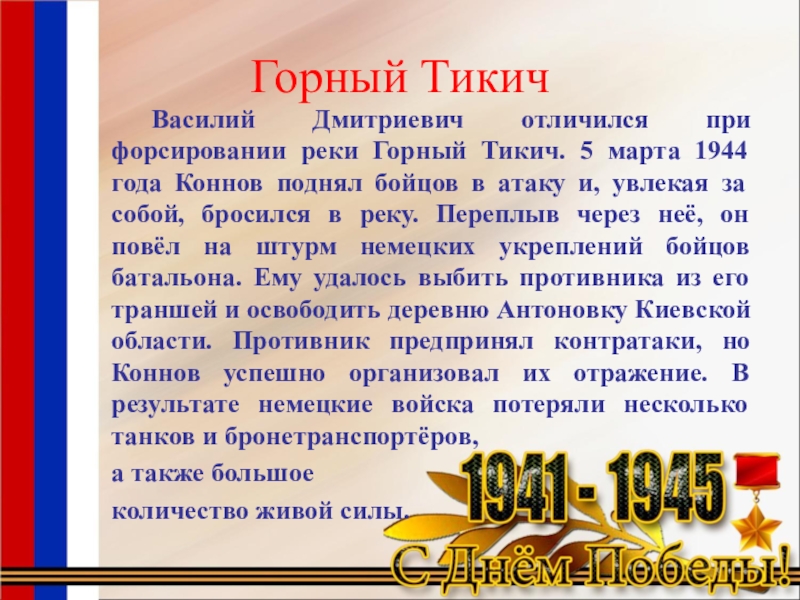 Тикич», гвардии капитан Василий Коннов был удостоен высокого звания Героя Советского Союза с вручением ордена Ленина и медали «Золотая Звезда»