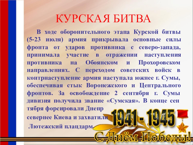 участие в отражении наступления противника на Обоянском и Прохоровском направлениях. С переходом советских войск в контрнаступление армия наступала южнее г. Сумы, обеспечивая стык Воронежского и Центрального фронтов. За освобождение 2 сентября г. Сумы дивизия получила звание «Сумская». В конце сентября форсировали Днепр